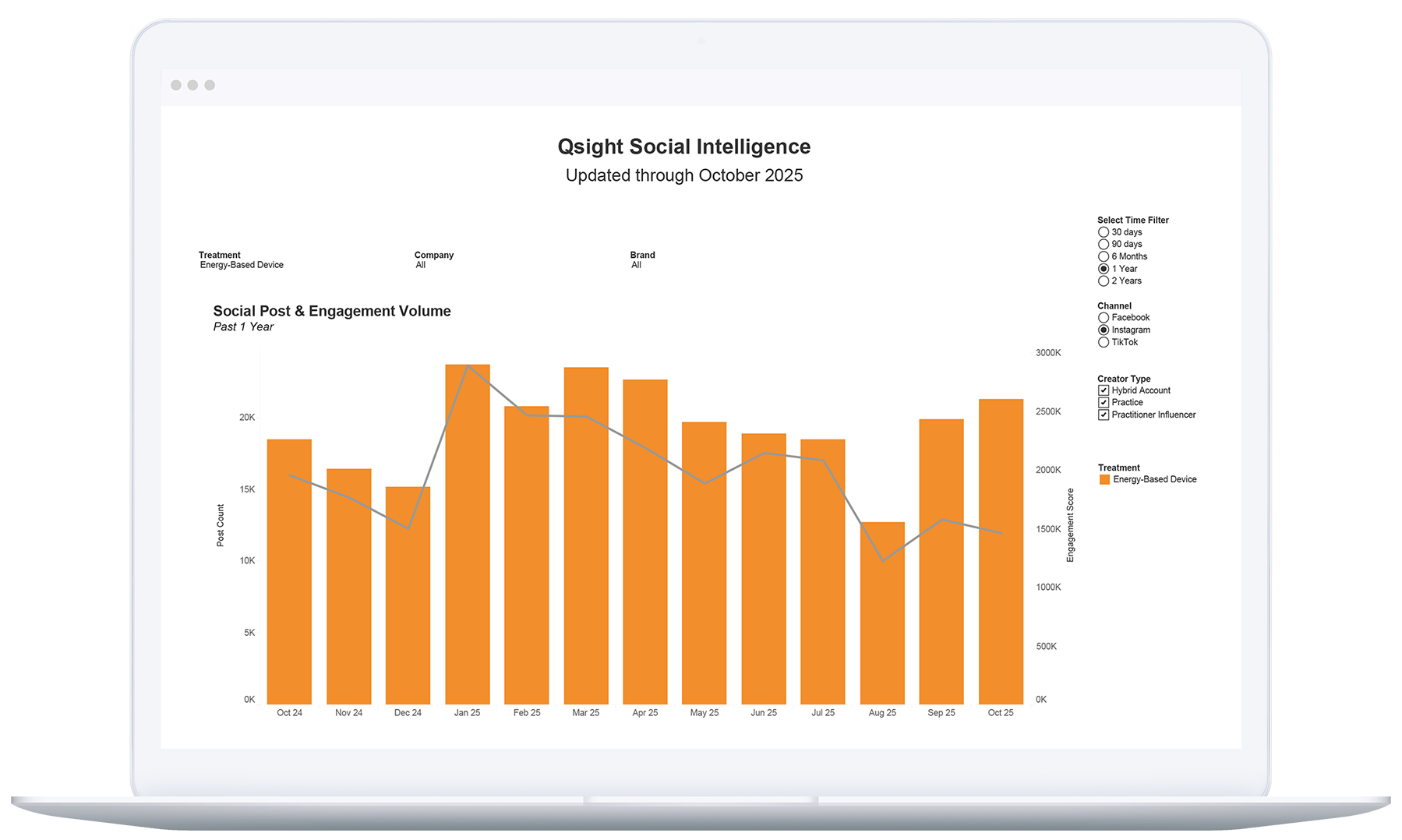 Purpose-built for the Medical Aesthetics industry, Qsight Social Intelligence captures the professional voices shaping the social conversation online—transforming verified aesthetic practitioner and practice activity across platforms like Instagram, TikTok, and Facebook into structured insights that reveal how influence drives visibility, engagement, and market growth.
